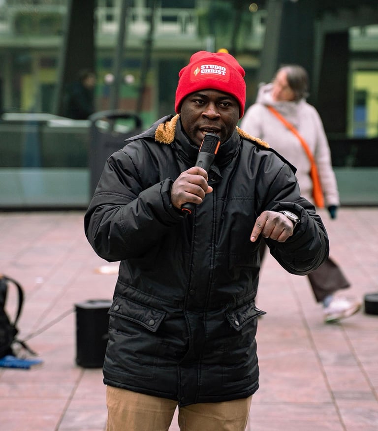 Gentil Mbafumoja is an evangelist born in eastern Democratic Republic of Congo, carrying a clear and unwavering calling to preach the Gospel of Jesus Christ to the lost. His life is marked by a deep passion for soul-winning and a strong anointing for street preaching. Week after week, Gentil stands faithfully in public spaces across the Netherlands, with regular outreach in Amsterdam, Almere and Lelystad, proclaiming Christ boldly and inviting people to respond to the message of salvation.