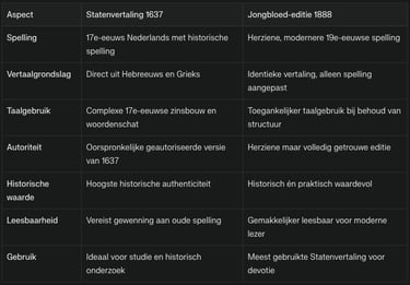 Belangrijk is dat ook deze editie een Statenvertaling blijft – de kern van de vertaling bleef behouden, maar werd in modernere spelling gepresenteerd. De Jongbloededitie behoort tot de meest gebruikte versies van de Statenvertaling.