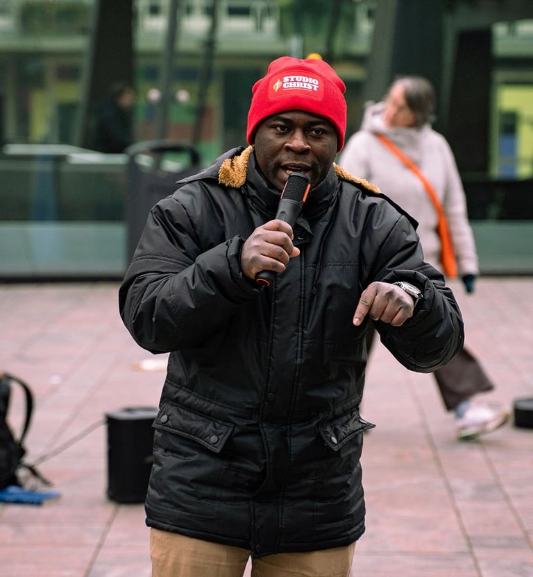 Gentil Mbafumoja is een evangelist geboren in het oostelijke deel van de Democratische Republiek Congo, met een duidelijke en standvastige roeping om het evangelie van Jezus Christus te prediken aan de verlorenen. Zijn leven wordt gekenmerkt door een diepe passie voor het winnen van zielen en een sterke zalving voor straatprediking. Week na week staat Gentil trouw in openbare ruimtes door heel Nederland, met regelmatige outreach in steden als Amsterdam, Almere en Lelystad, waar hij Christus moedig verkondigt en mensen uitnodigt om te reageren op de boodschap van redding.